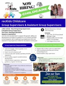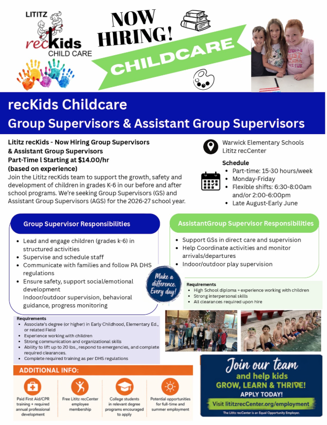 Ages 18+, if you enjoy and have experience working with preschool to school-aged children, consider joining our recKids Child Care team! Early morning, late afternoon, or summer hours M-F. Group Supervisors, Assistants, and substitutes to work at Lititz recCenter are needed. Find details HERE or APPLY NOW!